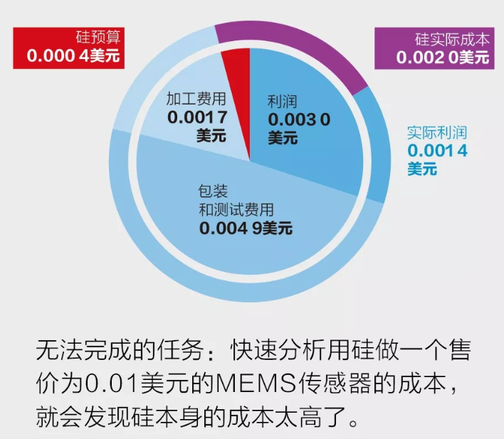 我們通過簡單的數(shù)學題來闡釋這一問題。(如果不想看,可直接跳至下一段。)如果1平方毫米的傳感器的售價為0.01美元,那么制造商制造該傳感器的成本不應超過0.007美元,因為大多數(shù)制造商希望在銷售該傳感器時至少能獲得30%的利潤率,即0.003美元的利潤。根據(jù)當今制造傳感器的經(jīng)驗法則,MEMS芯片的成本約為最終傳感器成品成本的30%,其余70%的成本用于傳感器的包裝、測試、電子數(shù)據(jù)讀出和校準。因此, MEMS芯片的成本就只能為0.007美元的30%,即約0.002美元。最后,硅材料大約占未包裝MEMS芯片成本的20%。這留給傳感器硅的預算僅為0.000 4美元。