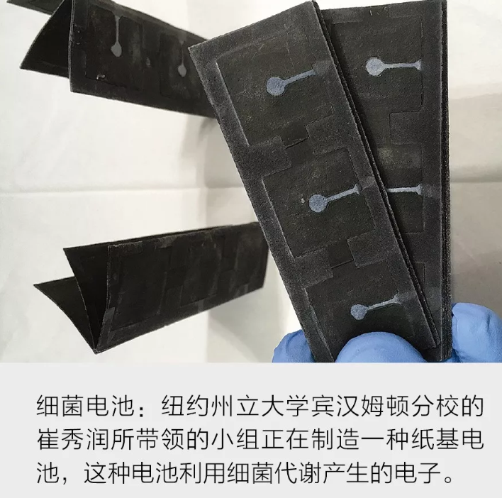 在紐約州立大學賓漢姆頓分校,崔秀潤(Seokheun Choi)小組正在開發(fā)一種紙基電池,這種電池具有一種非傳統(tǒng)的電子來源——細菌??梢栽谀嗫永镎业侥承┘毦?,在代謝食物時產(chǎn)生電子。這些細菌附著在印在紙上的金屬電極上,金屬電極收集排放出的電子。產(chǎn)生幾微安培的電流需要一堆細菌電池,這通過折紙手工很容易實現(xiàn)——只需將紙多折疊幾次。