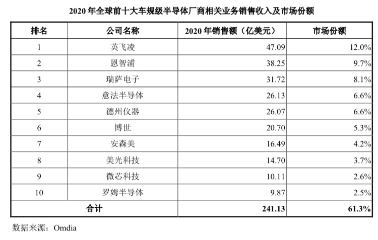 從全球市場競爭格局來看,國際廠商在車規(guī)級半導(dǎo)體領(lǐng)域中占據(jù)領(lǐng)先地位,根據(jù)Omdia統(tǒng)計,2020年全球前十大車規(guī)級半導(dǎo)體廠商中無國內(nèi)企業(yè)。